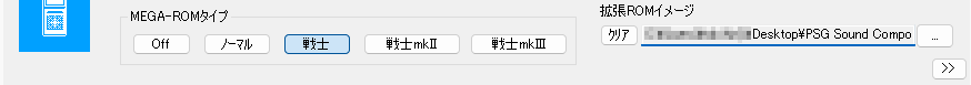 音楽演奏のチェックですが、エミュレータを使います。先に用意した PC6001VW4 を起動します。設定画面の下側、MEGA-ROM タイプを [戦士] に切り替えます。拡張 ROM イメージには自動生成されたSoundPlayer.bin を選択してください。この設定は記憶されますので、一度指定すれば以降は再設定の必要はありません。